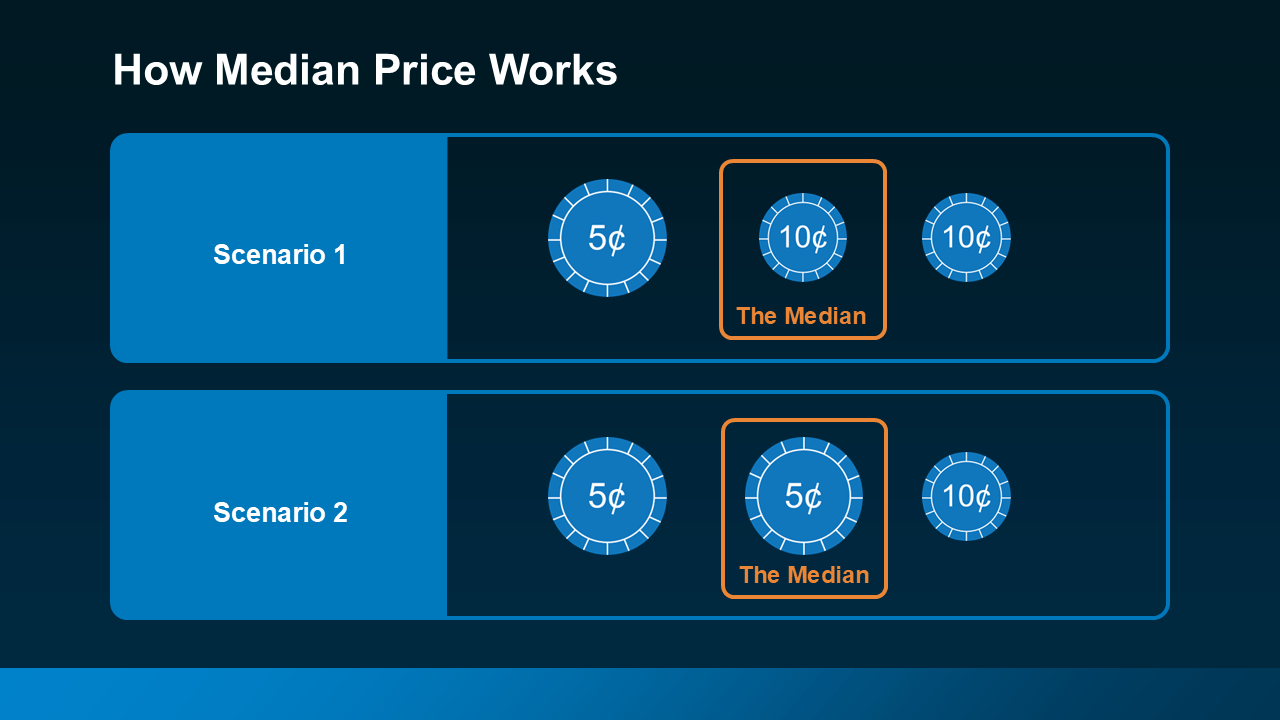 To show you how this works, here’s a simple explanation of a median (see visual below). Let’s say you have three coins in your pocket, and you decide to line them up according to their value from low to high. If you have one nickel and two dimes, the median (the middle one) is 10 cents. If you have two nickels and one dime, the median is now five cents.