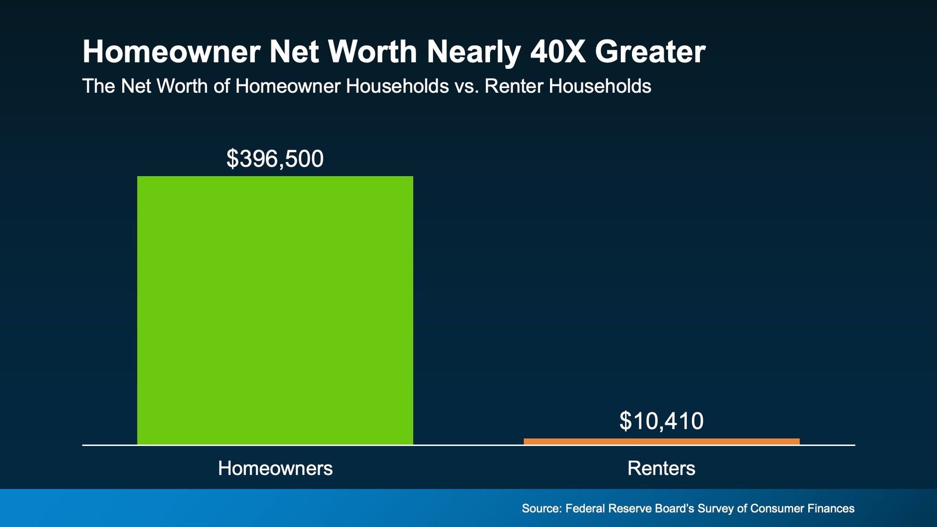 Today, the average homeowner’s net worth is nearly 40X greater than that of a renter. That’s a shocking difference, and the dollars in the visual below don’t lie (see graph below):