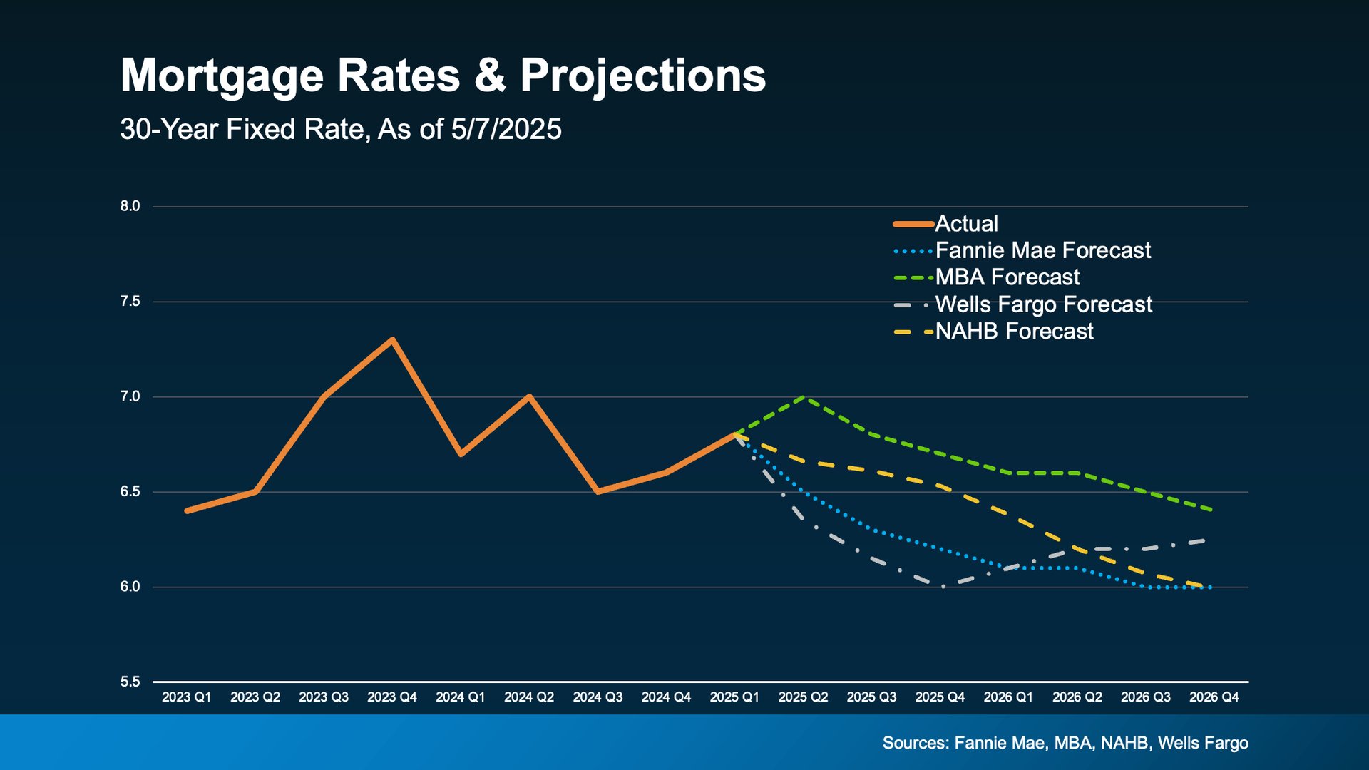 If you know a move is likely in your future, it may make sense to really think about your timeline. You certainly don’t have to move now. But financially, it may still be worth having a conversation about your options before prices inch higher. Because while rates are expected to come down, it’s not by much. And if you’re holding out in hopes we’ll see the return of 3% rates, experts agree it’s just not in the cards (see graph below):