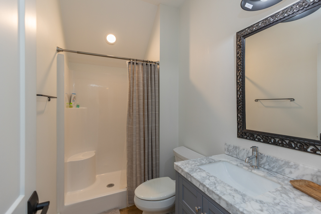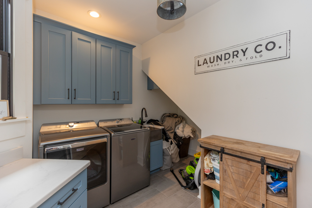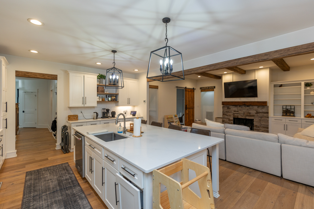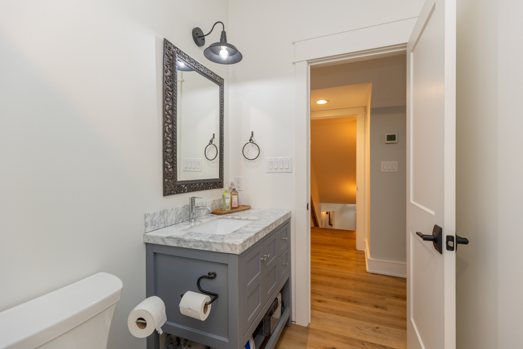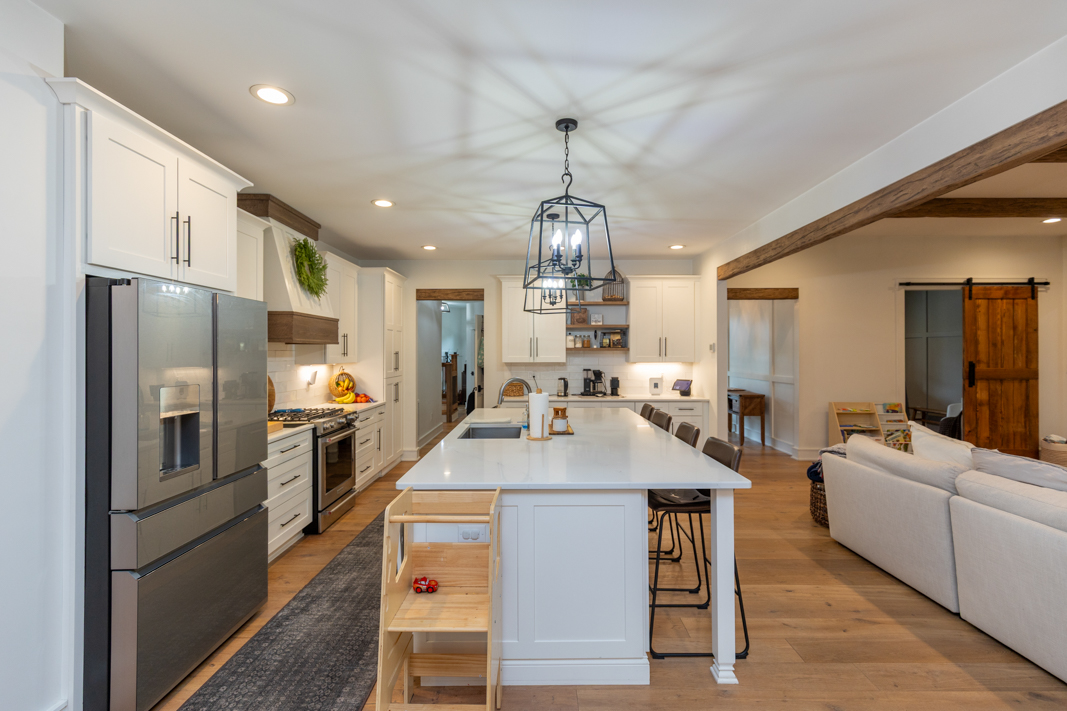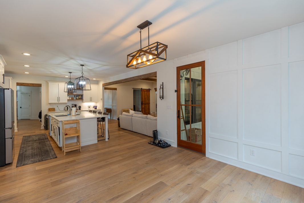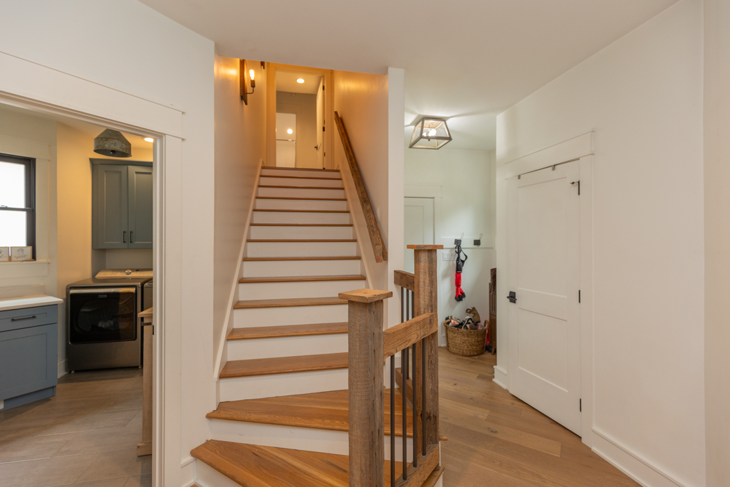 - Barn door, hall bench, stair rails, powder room sink base, range hood and kitchen shelves are 100+ year old reclaimed wood