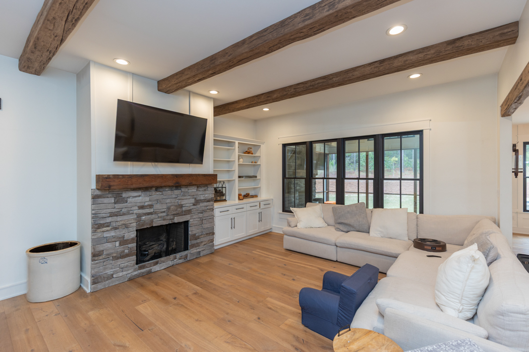 - Living room and screened porch mantels are reclaimed from a 150-year-old tobacco barn in Ellerbe NC