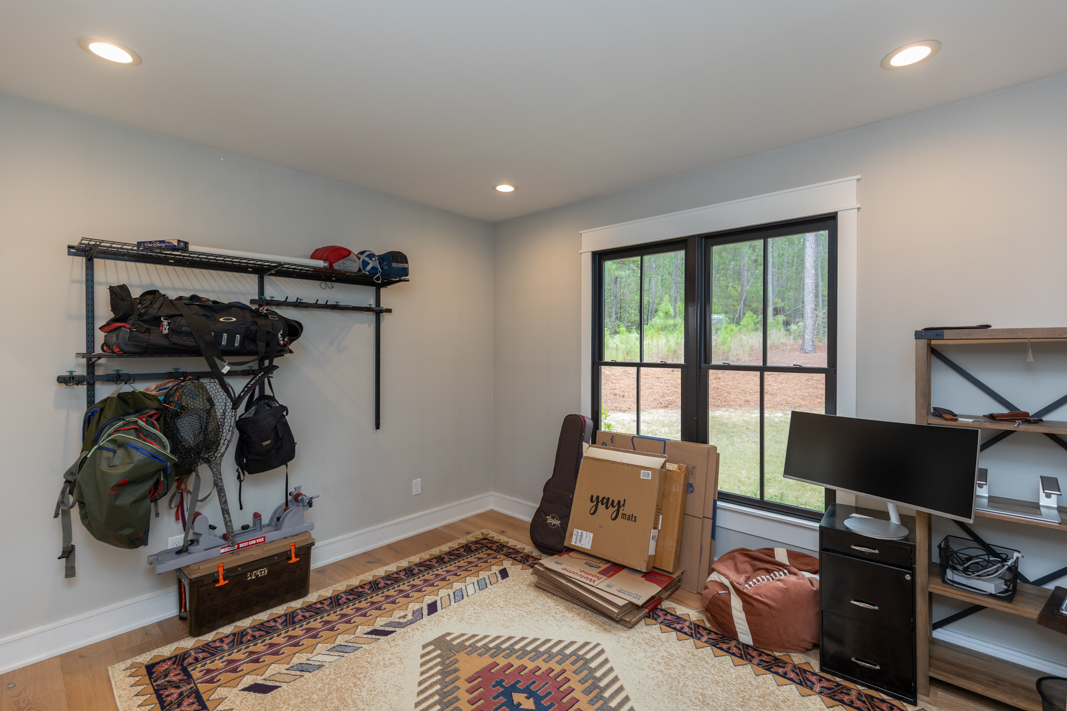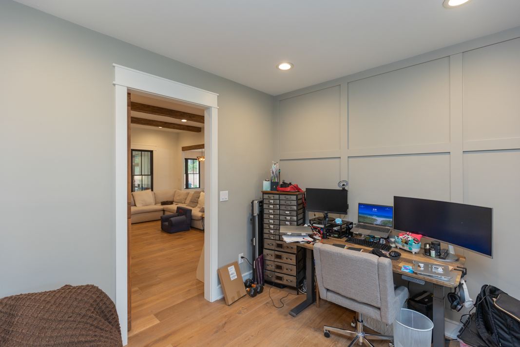 - Custom cabinetry with a 3-drawer filing cabinet under window seat in office and cabinets to sides are wired for printer, etc.