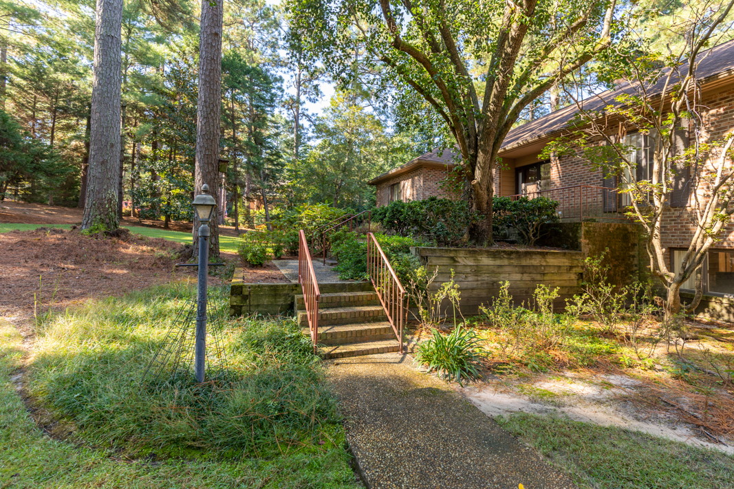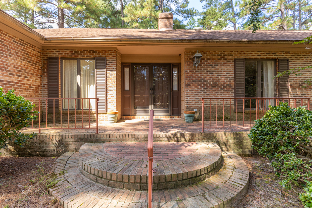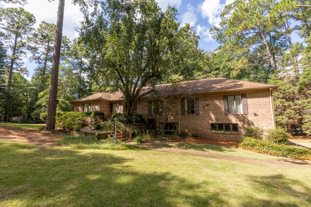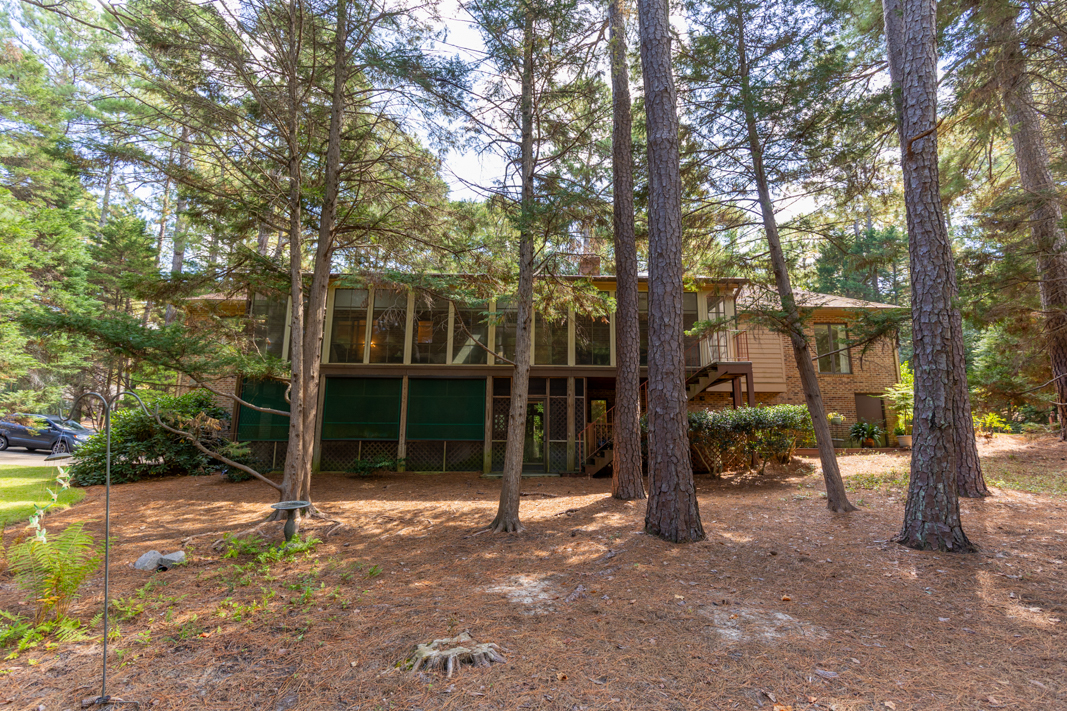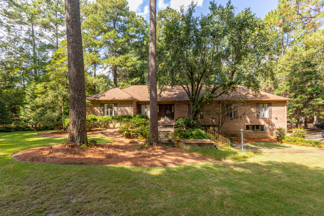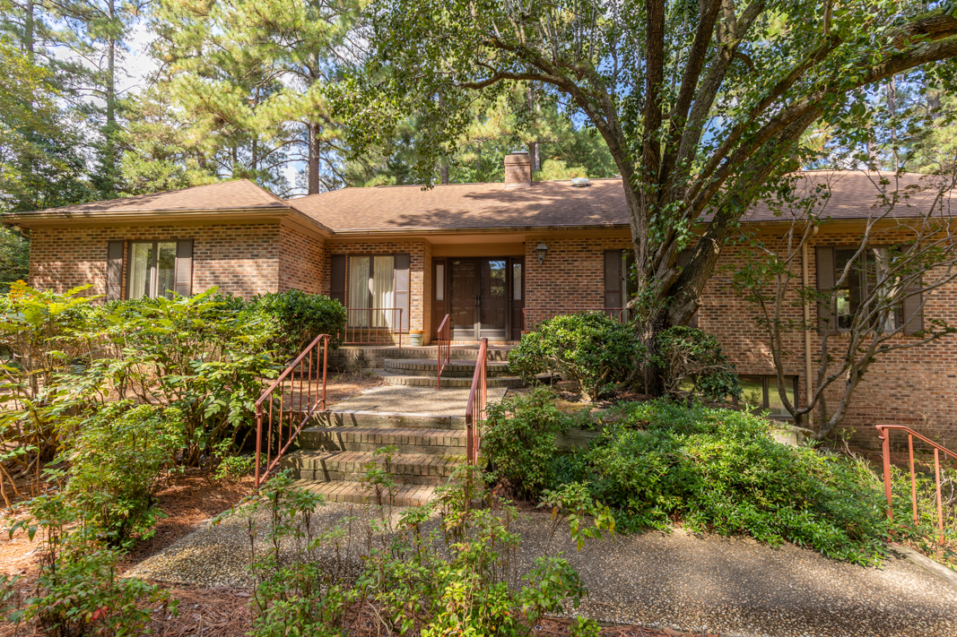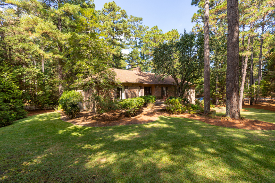 Situated on a beautiful, wooded corner lot in one of Pinehurst’s most established neighborhoods, this spacious brick home offers privacy, character, and convenience. Mature landscaping surrounds the property, creating a serene setting just minutes from the historic Village downtown, shopping and dining. Step inside to a warm and inviting interior featuring a large living room with a classic brick fireplace, raised hearth, and bookcases. Sliding glass doors open to an enclosed porch that spans the back of the home, ideal for enjoying your morning coffee or hosting guests. A generous dining room, accented with hardwood floors and chair rail trim, flows into a cozy breakfast nook with built-in desk and cabinetry. The kitchen features an abundance of rich wood cabinetry, granite countertops, and easy access to the porch and powder room. The spacious primary suite offers two large closets, an en-suite bath with a tiled jetted garden tub, walk-in tiled shower, and walk-in closet. A second main-level guest suite includes a full bath (also accessible from the hallway). There is also an office with gorgeous built-in cabinetry and bookcases and sliding glass doors to the back porch completes the main level. Downstairs, the fully finished lower level features a large family room with a second brick fireplace, ample closet space, a full bath, and laundry area, perfect as an in-law suite, guest space, or rec room. Sliding doors lead to a covered porch and deck, perfect for outdoor entertaining. A walk-in crawl space provides even more storage options. This beautifully maintained home combines timeless features with modern comforts, all in a prime Pinehurst location. The seller is offering a 3% commission to the buyer agent.